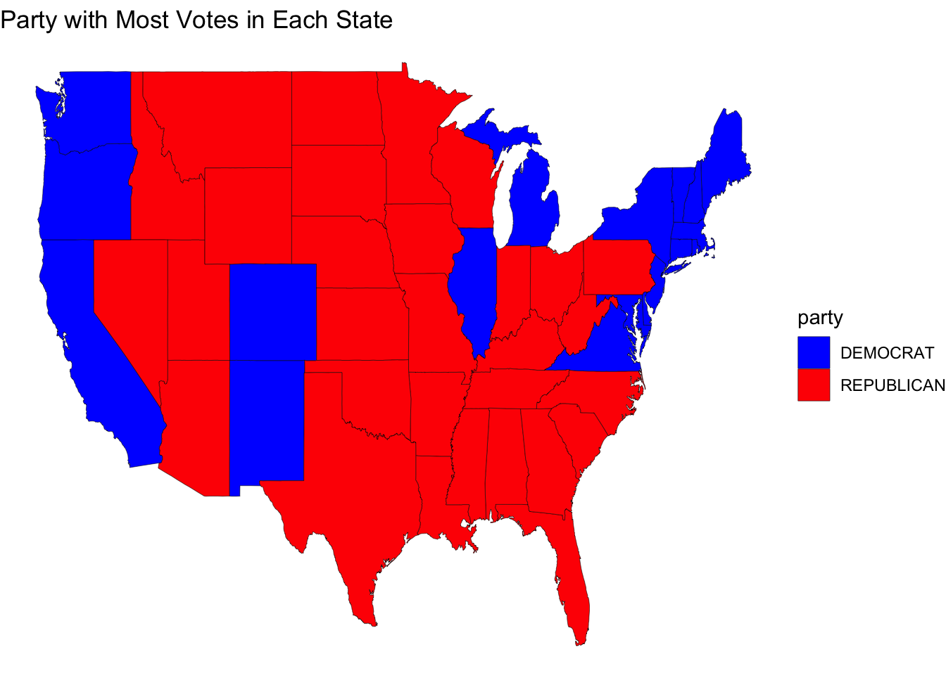totalvotes <- totalvotes[!(totalvotes$state =="ALASKA"| totalvotes$state=="HAWAII"),] usmapp <-map_data("state")#it has to match state in map_data functiontotalvotes$state <-tolower(totalvotes$state)electiondf <-left_join(totalvotes, usmapp, by =c("state"="region"))ggplot(data = electiondf, aes(x= long, y= lat, group = group, fill= party))+geom_polygon(color="black", size =0.1) +scale_fill_manual(values =c("DEMOCRAT"="blue", "REPUBLICAN"="red")) +# Set colors for partieslabs(title ="Party with Most Votes in Each State") +theme_void()