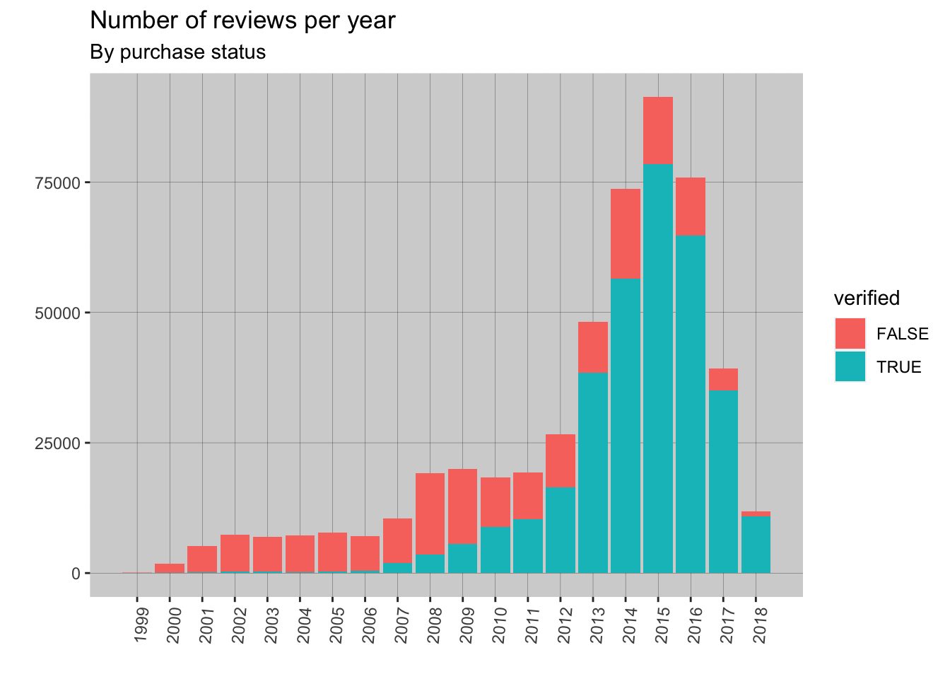 Whilst the number of verified reviews is substantially larger than the number of unverified reviews, the below histogram demonstrates that this has not been a consistent trend and that the large increase in the number of reviews is largely driven by an increase in verified reviews.