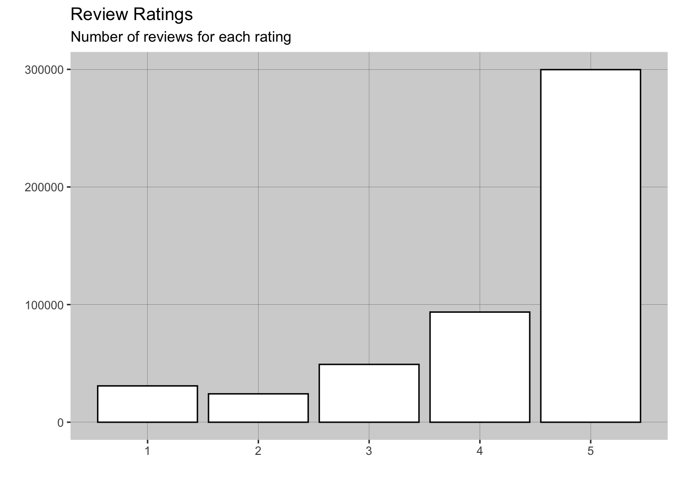 Amazon review ratings are provided on a scale of 1 (worst) to 5 (best) stars. The histogram below shows the total number of reviews assigned each rating.