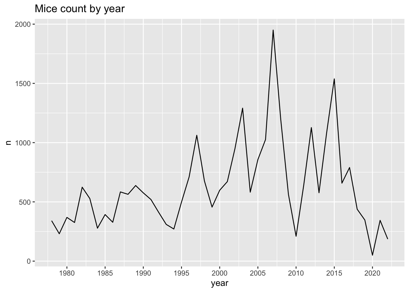 ggplot(mice_count_by_year, aes(x= year, y=n))+